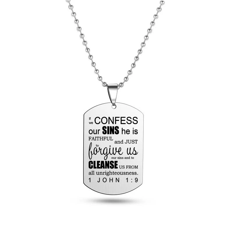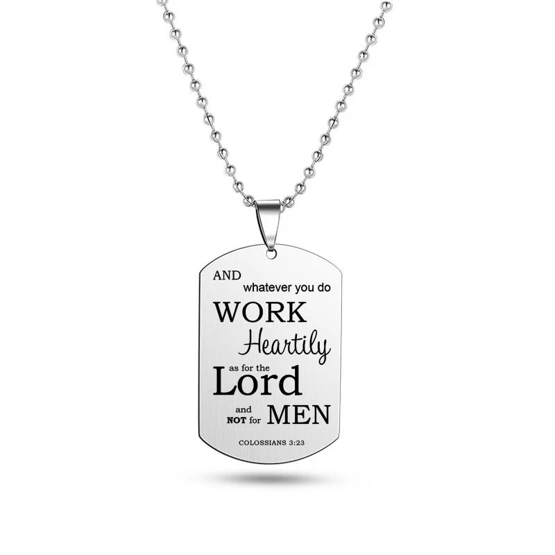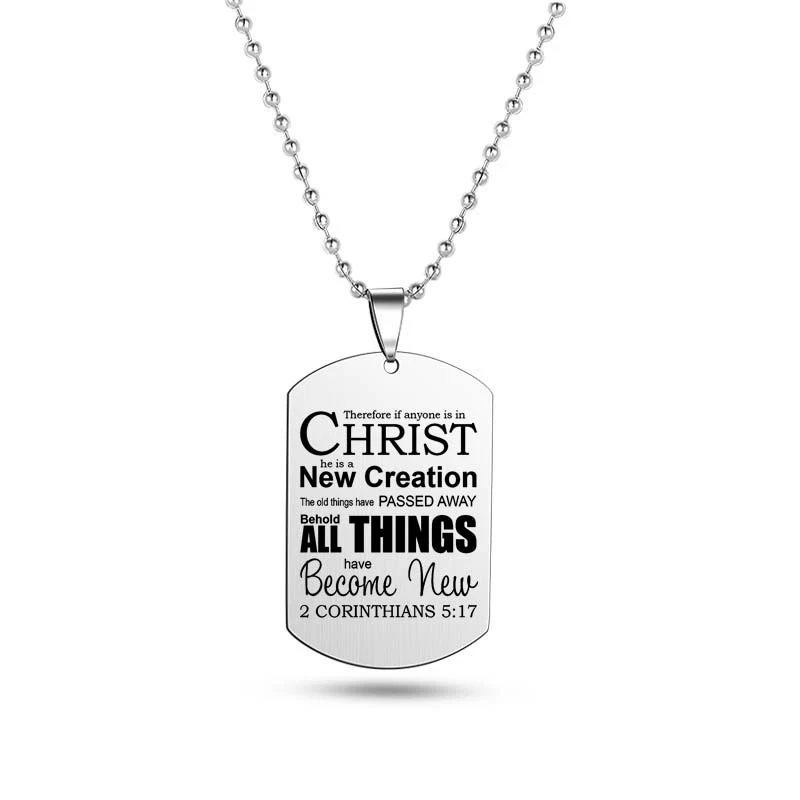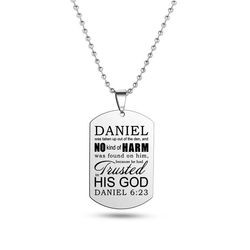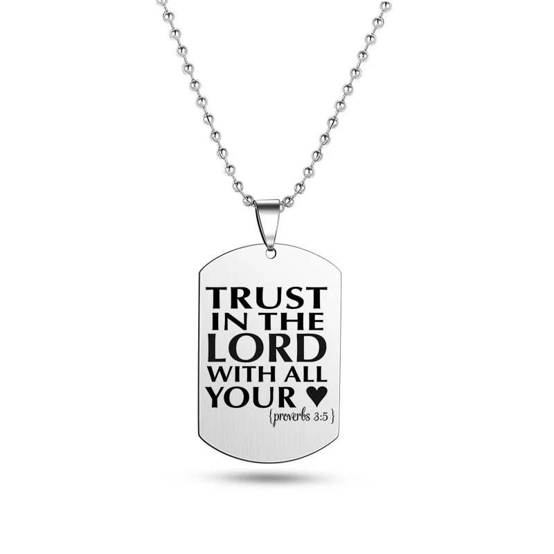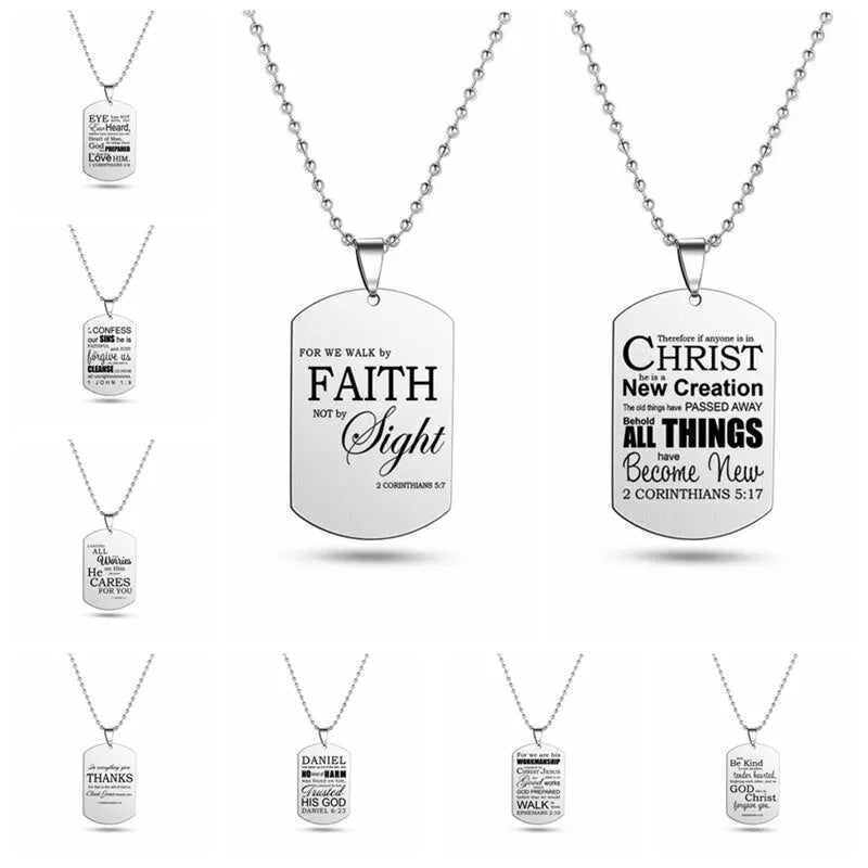 Crafted with precision from robust stainless steel, this elegantly designed pendant gracefully showcases Christian scriptures, paying homage to the timeless tenets of faith. The pendant measures a refined 2.6 x 4 x 0.15 cm, striking a balance between subtlety and prominence.