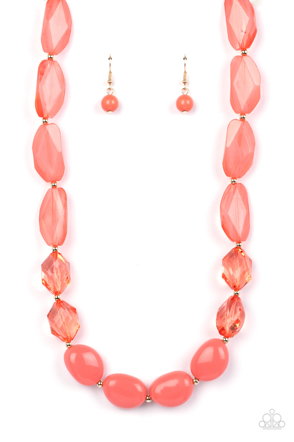 Separated by dainty gold beads, mismatched sections of icy, crystal-like, and coral acrylic beads are threaded along an invisible wire across the chest for a colorful flair. Features an adjustable clasp closure.
