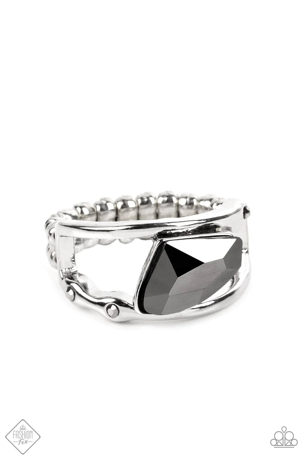 An asymmetrical, jagged piece of hematite emerges from between two bands of silver, creating a smoldering statement piece atop the finger. Tiny flecks of hematite are embedded in the silver bands, adding a hint of additional sparkle to the piece. Features a dainty stretchy band for a flexible fit.