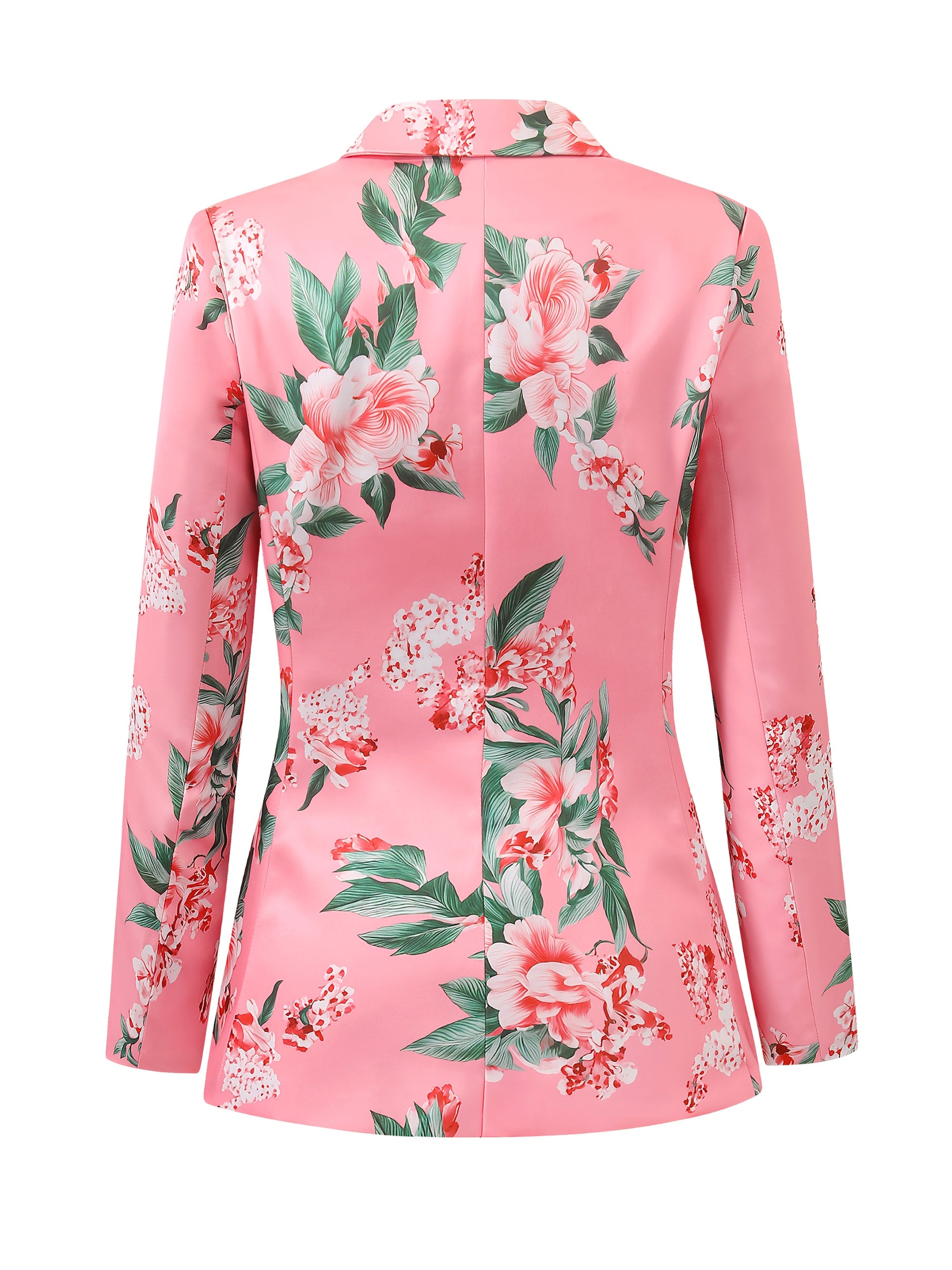 Make a bold statement with this striking floral satin blazer. Its light pink backdrop bursts to life with vivid white and green blossoms, demanding attention wherever you go. The long sleeves and sleek button-up silhouette add a touch of sophistication, while handy pockets add a practical twist. Perfect for turning heads at both casual meetups and formal affairs, this blazer dares you to stand out with fearless style.